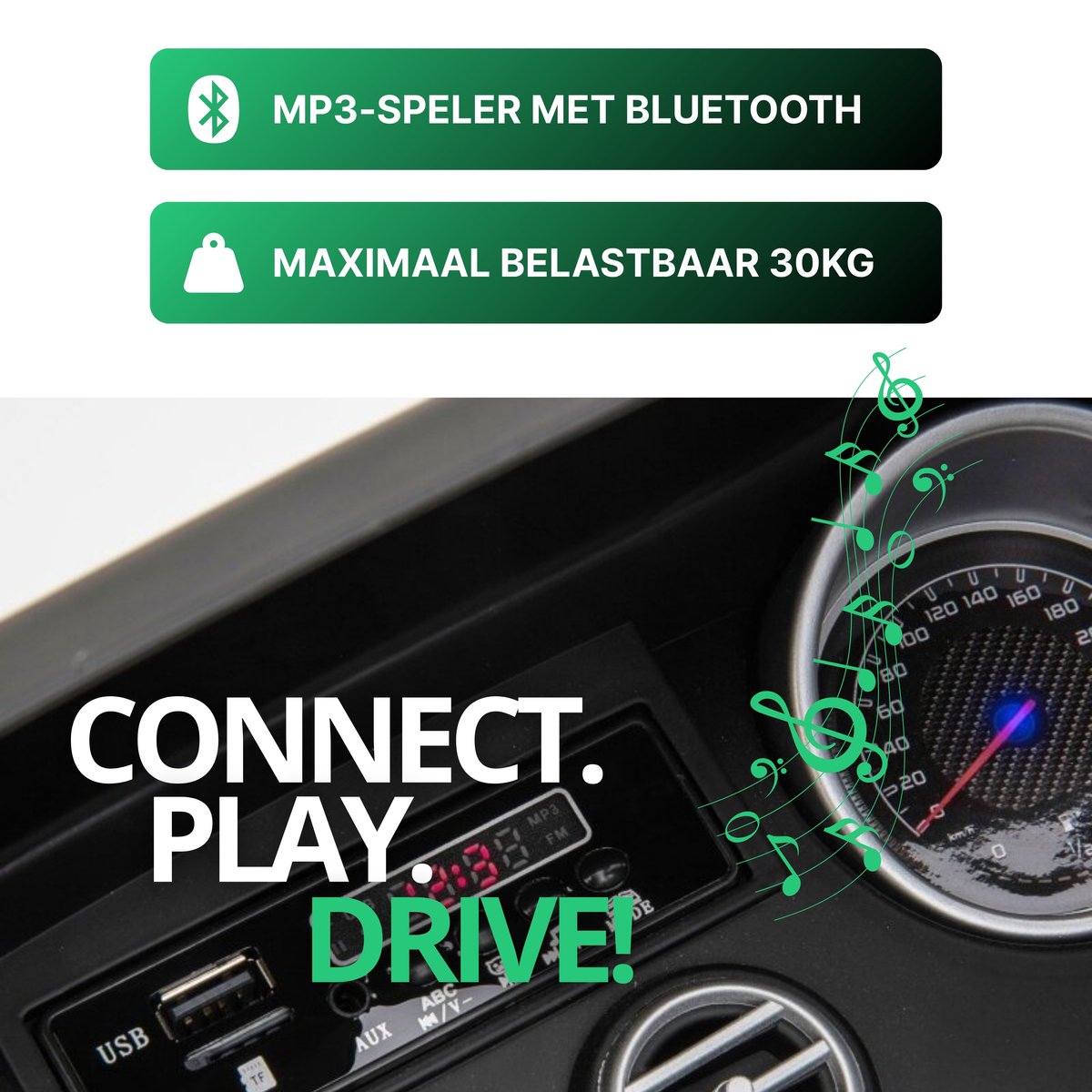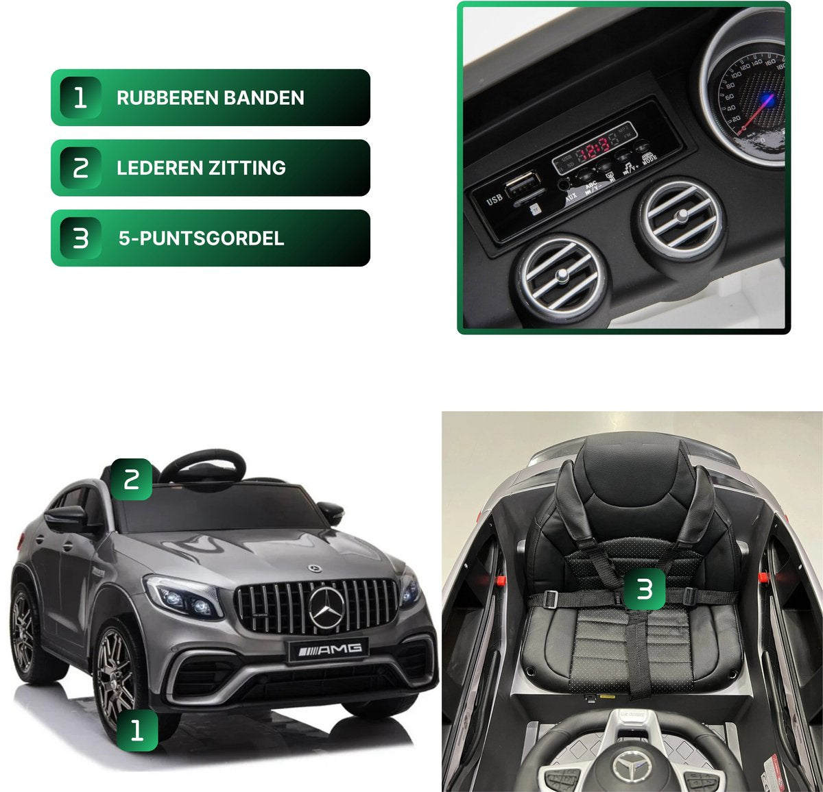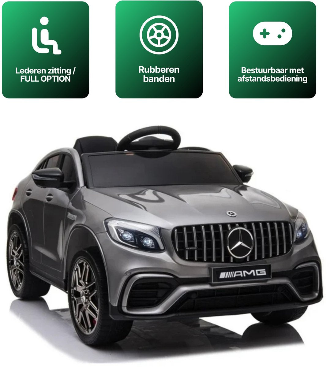 Jedes Kinderauto wird mit einer Fernbedienung geliefert, mit der Sie als Elternteil das Auto steuern können. Auch Kinder können selbst fahren. Während der Fahrt kann Ihr Kind lustige Lieder und Geschichten vom MP3-Player genießen. Alternativ können Sie über den USB- oder AUX-Anschluss auch Ihre eigene Musik abspielen. Das Kinderauto verfügt außerdem über eine attraktive LED-Beleuchtung und einen bequemen Ledersitz. Für die Sicherheit Ihres Kindes sorgt ein verstellbarer Sicherheitsgurt. Das Mercedes GLC 63s AMG Kinderauto besitzt ein Multifunktionslenkrad mit Hupenfunktion. Beim Anfahren und Beschleunigen ertönt zudem ein sportlicher Sound.