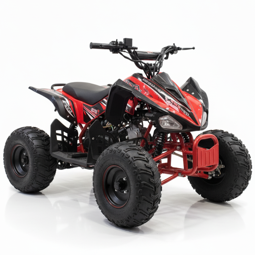 Dank der integrierten Beleuchtung vorne und hinten ist das Quad jederzeit gut sichtbar. Die rote Farbe verleiht diesem benzinbetriebenen Kinderquad einen coolen Look. Bestellen Sie Kinderquads bei uns zu attraktiven Preisen. Sie können Ihr Quad zudem wahlweise in unserem Geschäft abholen oder sich bequem nach Hause liefern lassen. In jedem Fall erhalten Sie das Modell fahrbereit und vollgetankt. So kann Ihr Sohn oder Ihre Tochter sofort mit dem coolen Kinderquad losfahren.