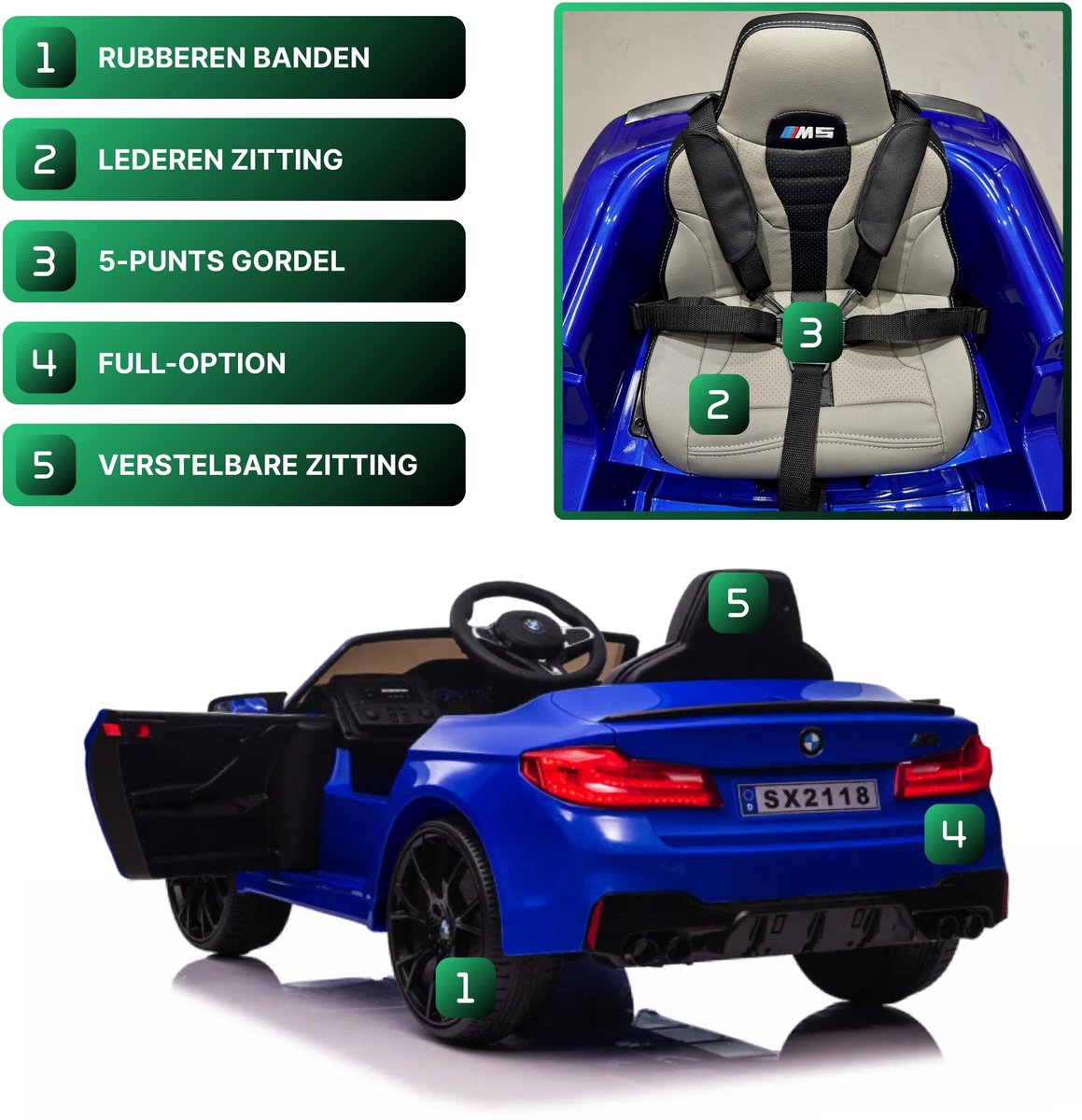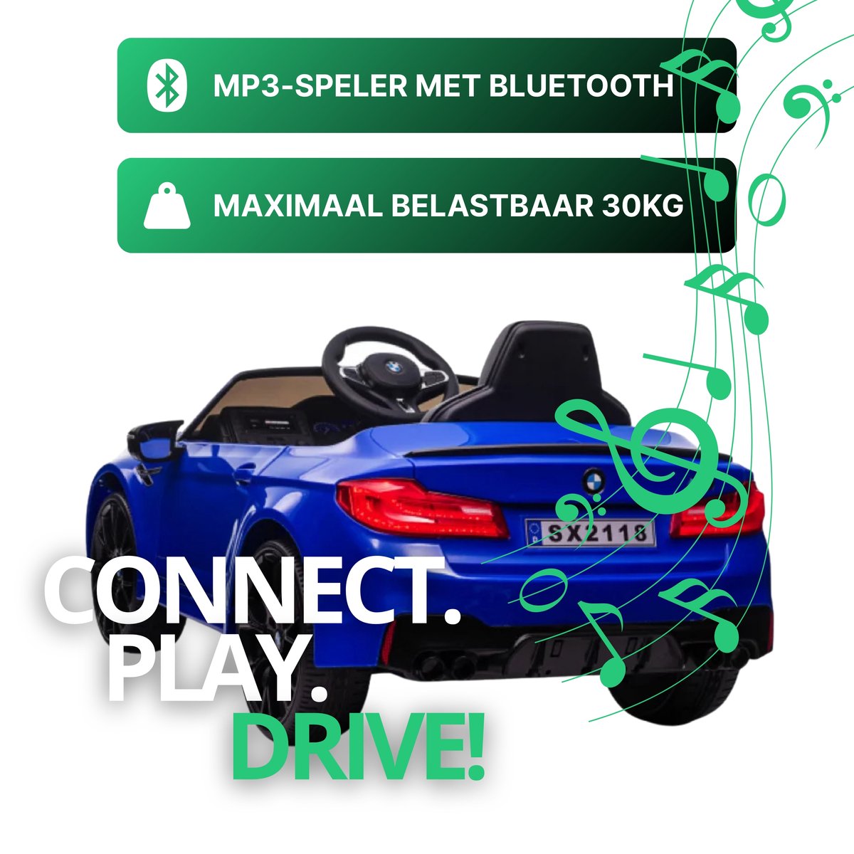 Mit einer Höchstgeschwindigkeit von 8 km/h und zwei Geschwindigkeitsstufen müssen Sie sich keine Sorgen machen, dass dieses BMW M5 Kinderauto zu schnell wird. Dank der im Lieferumfang enthaltenen Fernbedienung können Sie das Auto auch manuell lenken. Der verstellbare Ledersitz sorgt für bequemen Sitzkomfort Ihres Kindes. Der Sitz ist mit einem 5-Punkt-Gurt ausgestattet. Dank des integrierten MP3-Players wird jede Fahrt zum Vergnügen. Dieses Zubehör ist mit Bluetooth, USB und einem AUX-Eingang ausgestattet. So können Sie während der Fahrt Musik und Geschichten hören.