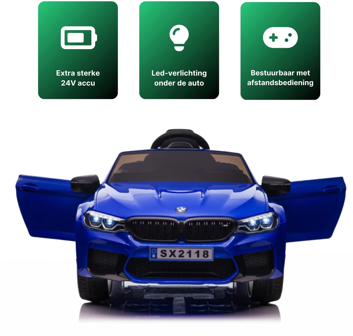 Neu bei CarKiddo: der beliebte BMW M5 in extragroßer Ausführung , 24-V-Batterie. Mit seiner 24-V-Batterie ist dieses BMW M5 Elektro-Kinderauto ein auffälliges Modell. Sie fragen sich vielleicht: Inwieweit ist das ein echtes BMW-Auto? Dieses Kinderauto ist offiziell zugelassen und somit ein echtes BMW M5 Kinderauto. Wenn Sie selbst einen BMW fahren, ist es etwas ganz Besonderes, Ihrem Kind einen BMW M5 24V zu schenken. Dann kann es im selben Auto wie Mama und Papa mitfahren. Das regt die Fantasie eines Kindes wirklich an. Ausgestattet mit einem beleuchteten Armaturenbrett, Beleuchtung im Beinraum und sogar Beleuchtung unter dem Auto! Aber dieses elektrische BMW-Kinderauto hat noch mehr Funktionen, die den Kauf dieses Modells lohnenswert machen.