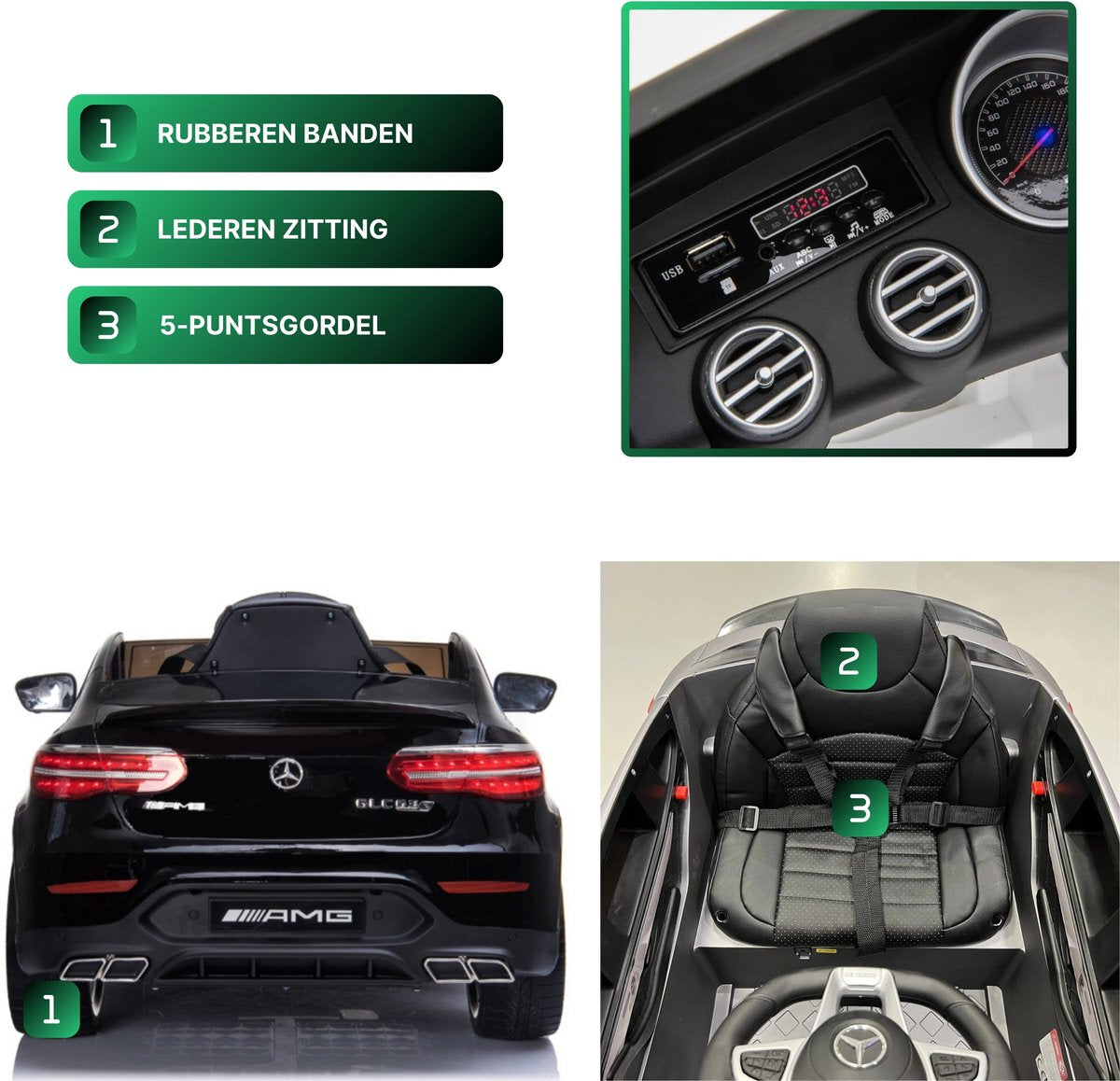 Jedes Kinderauto wird mit einer Fernbedienung geliefert, mit der Sie als Elternteil das Auto steuern können. Auch Kinder können selbst fahren. Während der Fahrt kann Ihr Kind lustige Lieder und Geschichten vom MP3-Player genießen. Alternativ können Sie über den USB- oder AUX-Anschluss auch Ihre eigene Musik abspielen. Das Kinderauto verfügt außerdem über eine attraktive LED-Beleuchtung und einen bequemen Ledersitz. Für die Sicherheit Ihres Kindes sorgt ein verstellbarer Sicherheitsgurt. Das Mercedes GLC 63s AMG Kinderauto besitzt ein Multifunktionslenkrad mit Hupenfunktion. Beim Anfahren und Beschleunigen ertönt zudem ein sportlicher Sound.