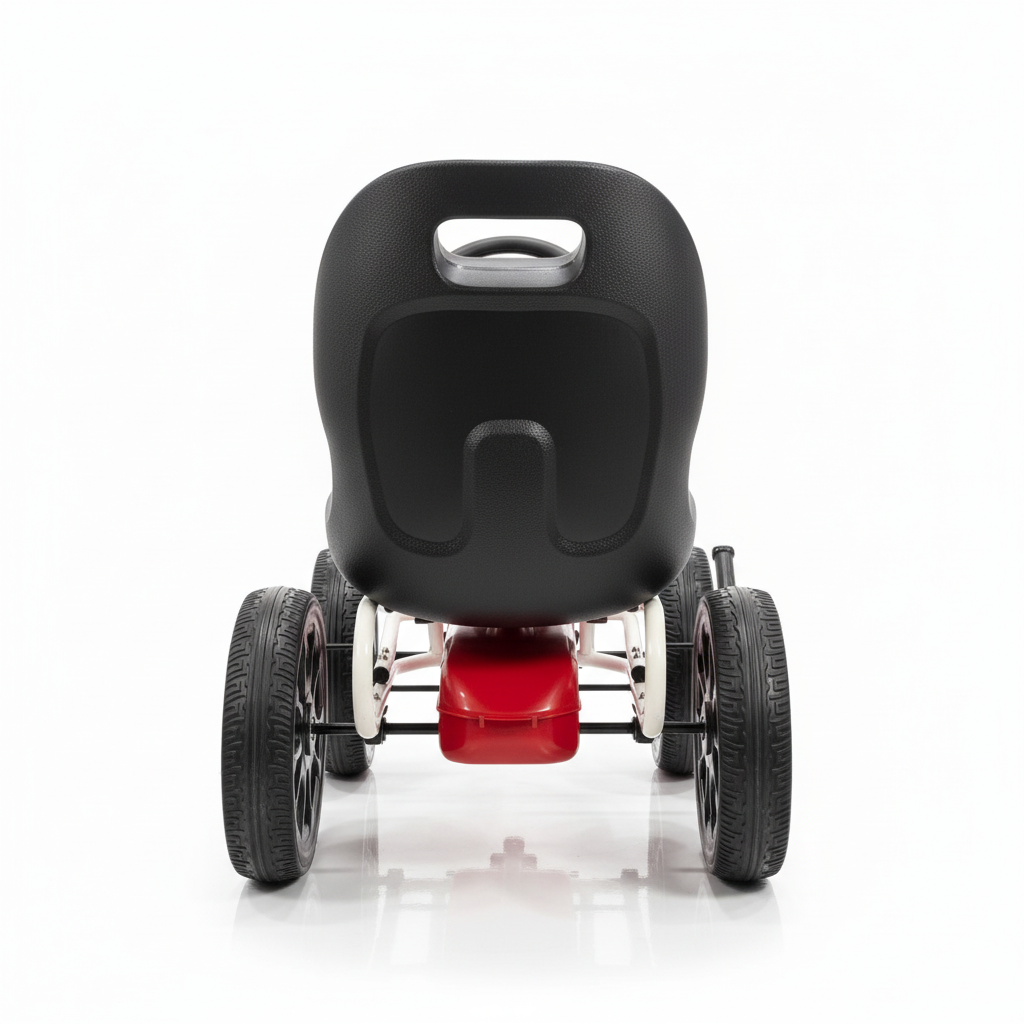 Der Fahrkomfort ist erstklassig. Die Pedale lassen sich leichtgängig bedienen, sodass beim Fahren kein Schwung verloren geht. Die Echtgummireifen tragen ebenfalls zum Fahrkomfort bei. Während der Fahrt können Sie mit dem Schalthebel zwischen Vorwärts- und Leerlauf wechseln. Es gibt außerdem eine Handbremse, die beide Hinterräder bremst. Das schlanke und ergonomische Design macht deutlich, warum dieses Abarth-Gokart derzeit so beliebt ist.