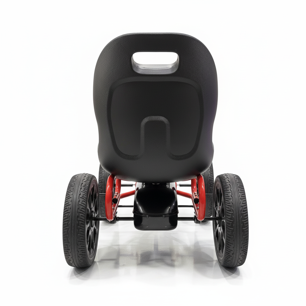 Der Fahrkomfort ist erstklassig. Die Pedale lassen sich leichtgängig bedienen, sodass beim Fahren kein Schwung verloren geht. Die Echtgummireifen tragen ebenfalls zum Fahrkomfort bei. Während der Fahrt können Sie mit dem Schalthebel zwischen Vorwärts- und Leerlauf wechseln. Es gibt außerdem eine Handbremse, die beide Hinterräder bremst. Das schlanke und ergonomische Design macht deutlich, warum dieses Abarth-Gokart derzeit so beliebt ist.