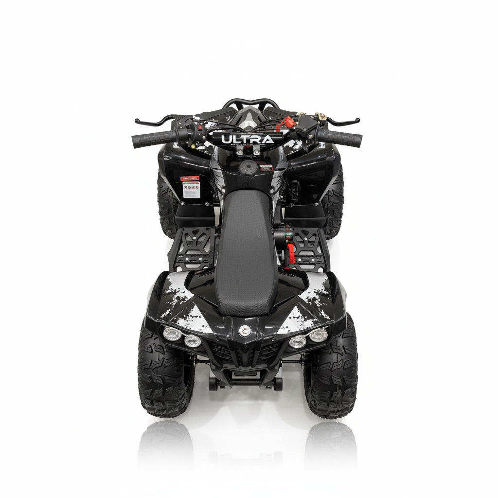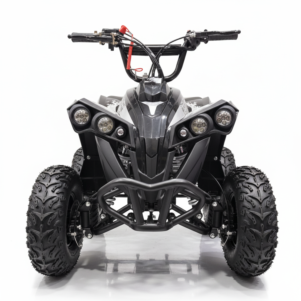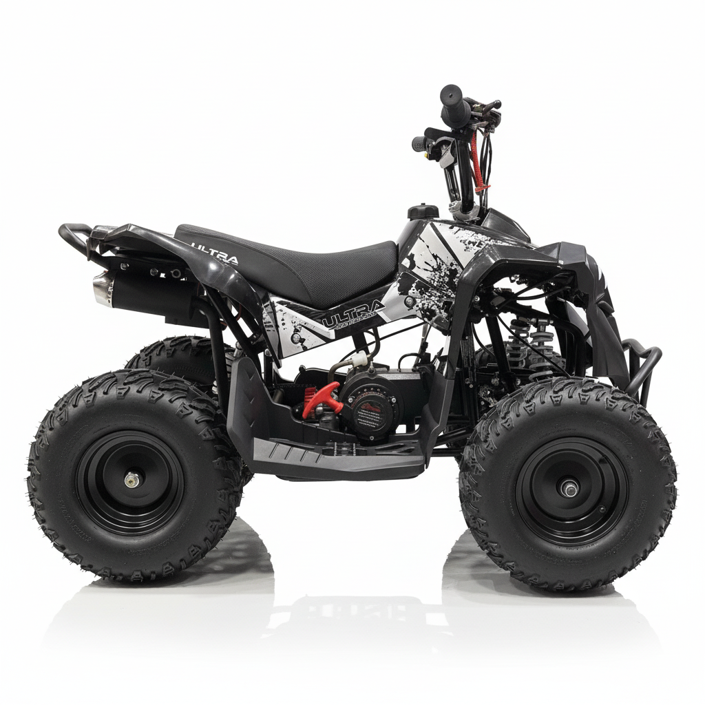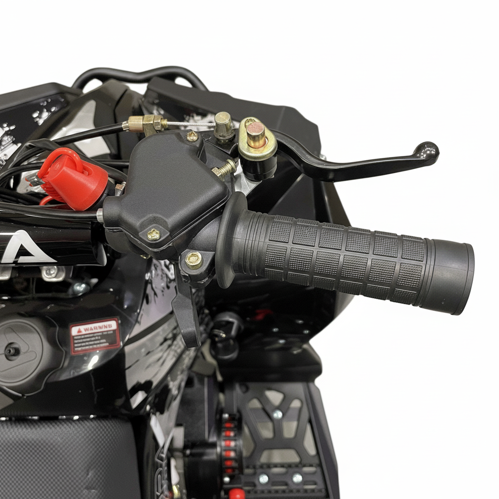 Dieses Infinity ATV Kinderquad hat einen Hubraum von 49 ccm. Es ist ebenfalls ein 2-Takt-Quad. Dieses automatische Kinderquad wird mit Benzin betrieben. Es verfügt über einen Elektrostarter und einen Seilzugstarter. Seine Optik ist auffällig. Das liegt nicht nur an der coolen schwarzen Farbe, sondern auch am superstarken Rahmen. Dieses 49 ccm Kinderquad hält einiges aus. Der Motor ist erstklassig und mit modernster Technologie ausgestattet. Außerdem verfügt es über einen neuen Vergaser. Wie Sie sich vorstellen können, bietet dieses benzinbetriebene Kinderquad eine hervorragende Leistung.