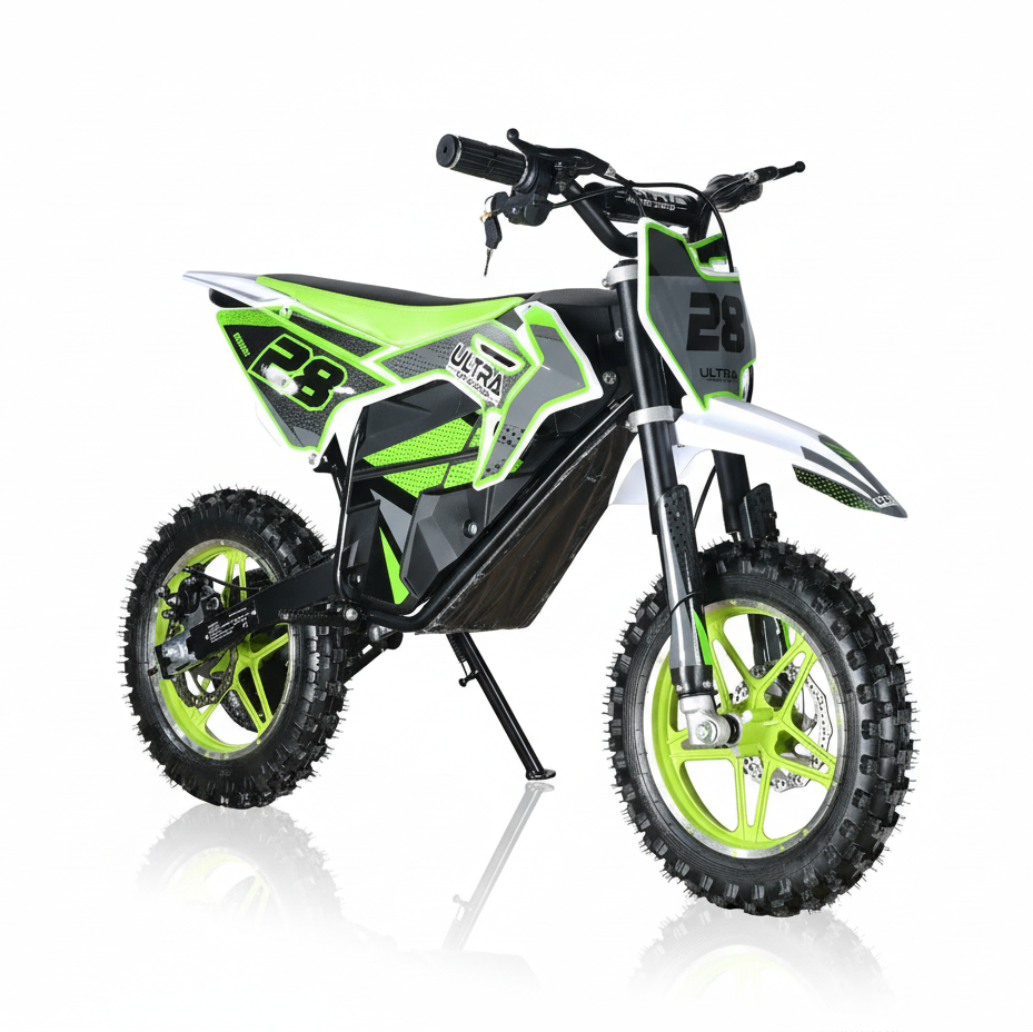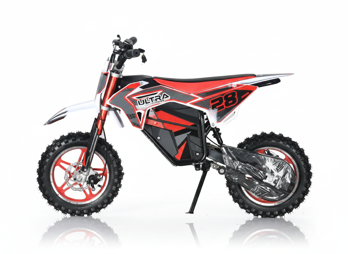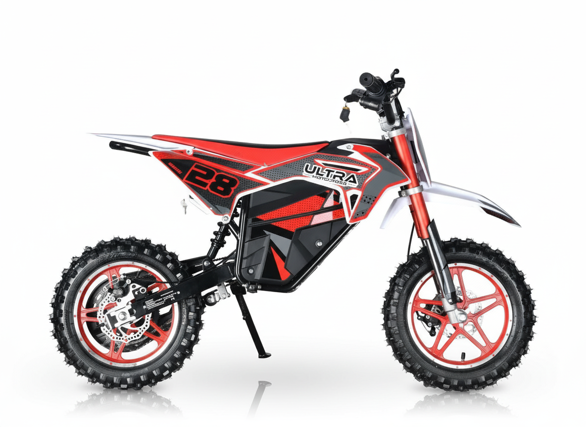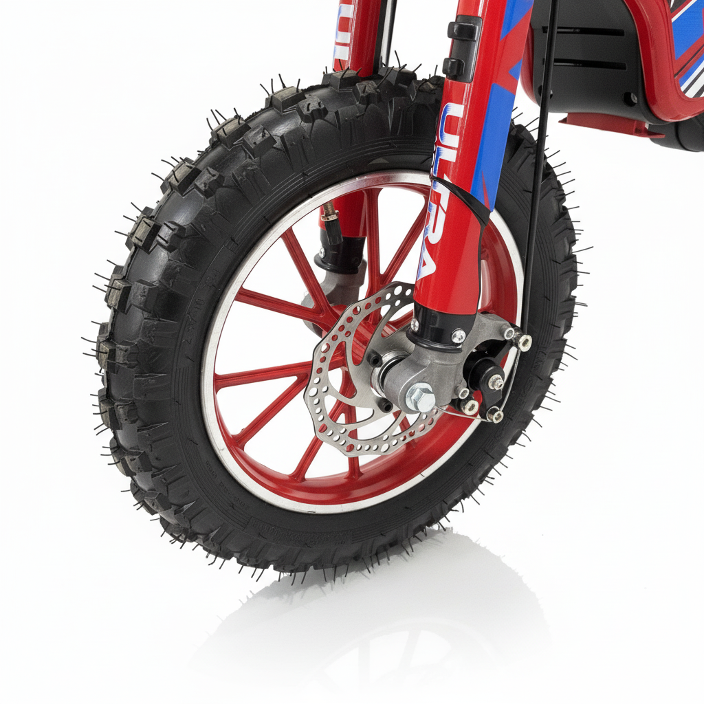 Dieses rote Kinder-Dirtbike besticht durch seine Power. Es verfügt über eine Gesamtleistung von 1000 Watt und einen 36V Akku. Damit hat dieses Modell genug Power, um jeden noch so rauen Untergrund zu meistern. Dazu tragen auch die Gummi-Luftreifen und der extra stabile Metallrahmen bei. Sogar Cyclocross ist mit diesem roten Elektro-Kinder-Dirtbike möglich. So viele Möglichkeiten eröffnen sich dir mit diesem Kinderfahrzeug. Wir haben nicht übertrieben, als wir sagten, dies sei das ultimative Kinder-Dirtbike. Überzeuge dich selbst, warum.