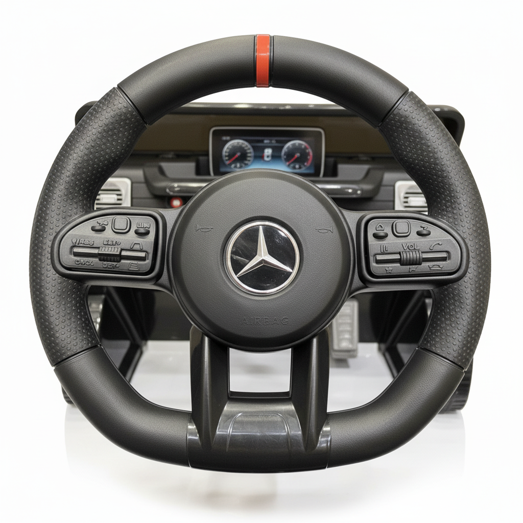 Das Kinderauto verfügt außerdem über eine attraktive LED-Beleuchtung und einen bequemen Ledersitz. Zur Sicherheit können Sie Ihr Kind mit einem verstellbaren Beckengurt sichern. Das Mercedes G63 AMG Kinderauto verfügt über ein Multifunktionslenkrad mit Hupgeräusch. Beim Starten ertönt außerdem ein angenehmer Sportsound.