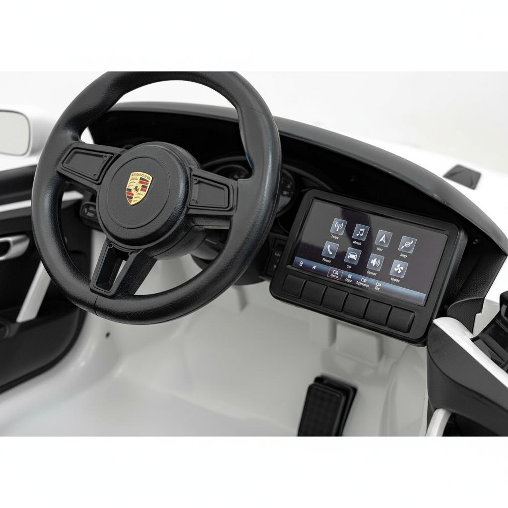 Eine komfortable Fahrt ist garantiert, denn dieses Porsche 718 Kinderauto verfügt über Ledersitze und eine Federung. Die Gummireifen sorgen für ein angenehmes Fahrgefühl und ermöglichen das Fahren auf unterschiedlichen Untergründen. Die Höchstgeschwindigkeit dieses Modells beträgt 6 km/h. Dank der mitgelieferten Funkfernbedienung können Eltern das Porsche Kinderauto jederzeit steuern. Die originalgetreue LED-Beleuchtung sorgt dafür, dass das Modell auch im Dunkeln gut sichtbar ist. Dank des integrierten MP3-Players mit USB-Anschluss, AUX-Eingang und Bluetooth kann Ihr Kind außerdem seine Lieblingsmusik hören.
