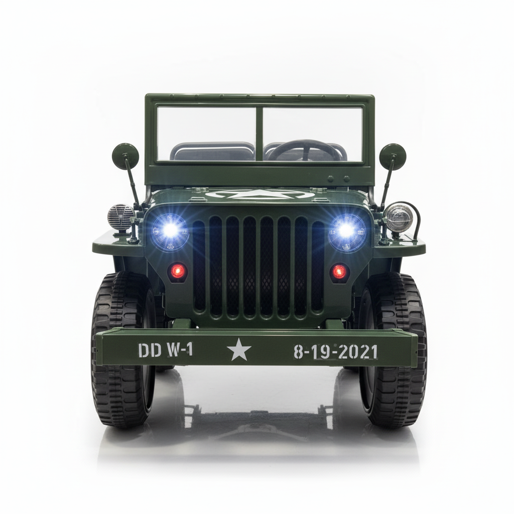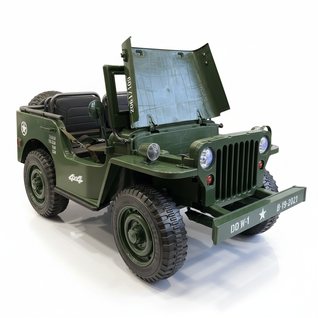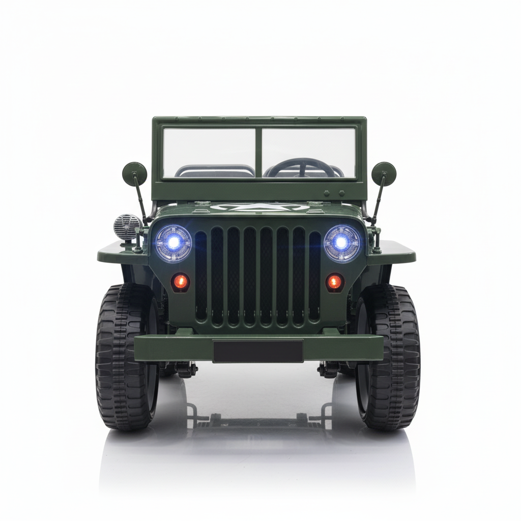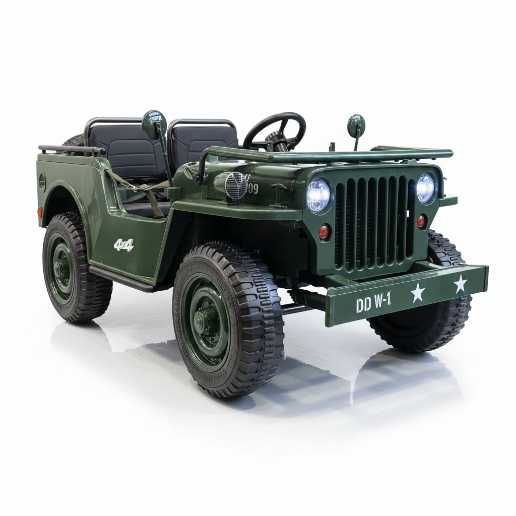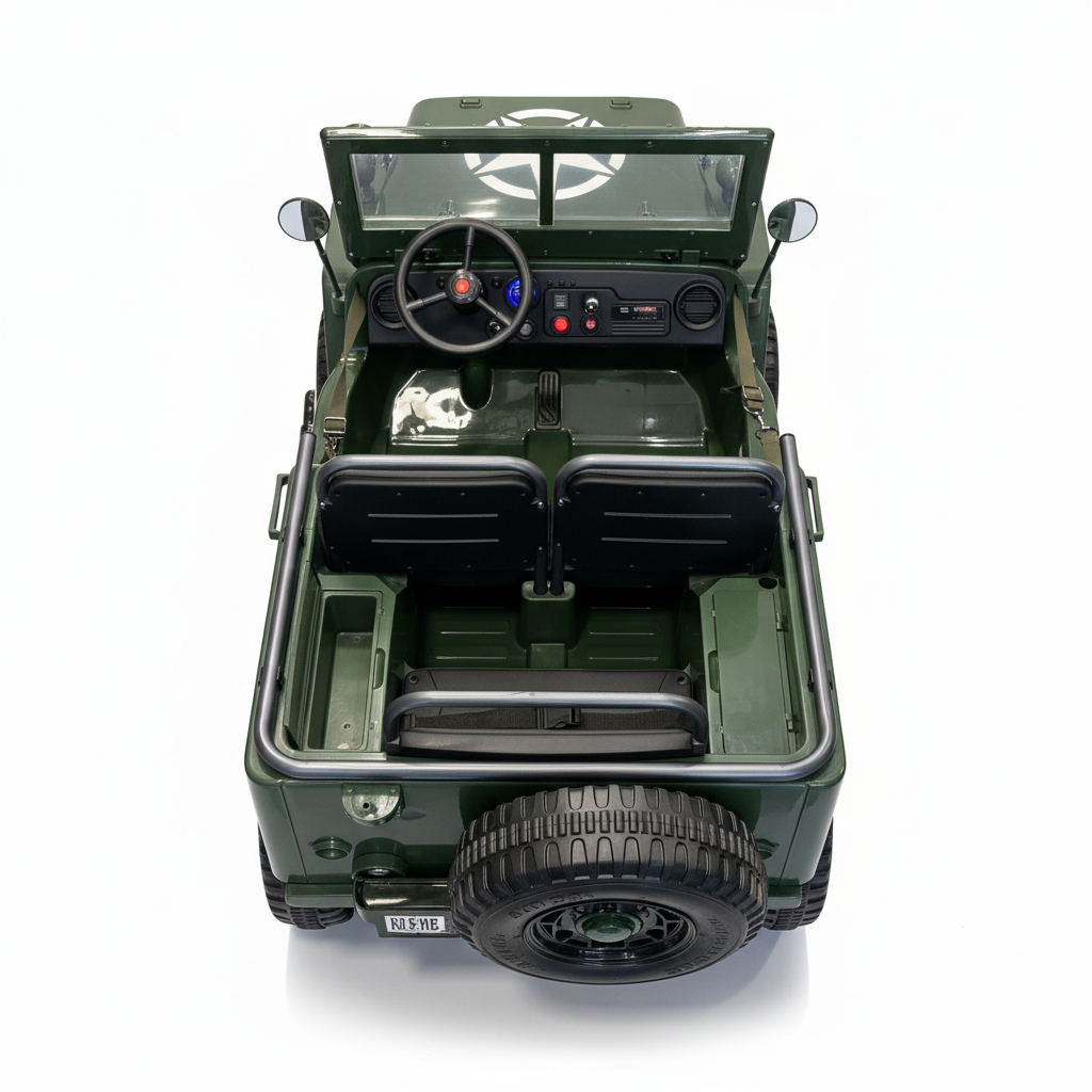 Dieser Willy's Kinderjeep ist jetzt in Matcha (Dunkelgrün) und Khaki (Beige/Sand) erhältlich. Dieser elektrische Kinderjeep von Willy's basiert auf dem Kultjeep, den Sie vielleicht aus Filmen wie Jurassic Park und Rambo kennen. Der Willy's Jeep war in den 1940er Jahren auch die Ikone der amerikanischen Armee. Dieser Kultjeep ist jetzt auch für Kinder erhältlich. Dies ist ein vollelektrischer Kinderjeep. Der Willy's Jeep bei CarKiddo ist einzigartig und komplett ausgestattet mit einer 24-V-Batterie, Allradantrieb, Ledersitzen und Gummireifen. Dieser elektrische Kinderjeep bietet insgesamt Platz für drei Kinder, was dreimal so viel Spaß bedeutet. Dieser batteriebetriebene Kinderjeep ist perfekt für Familien mit mehreren Kindern.
